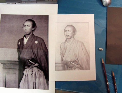 今回は、技法的なところをメインにして制作段階をご紹介する目的があるので、一般に良く知られた人物であることを条件に選び、幕末の志士「坂本龍馬」の肖像をつくることに決めました。