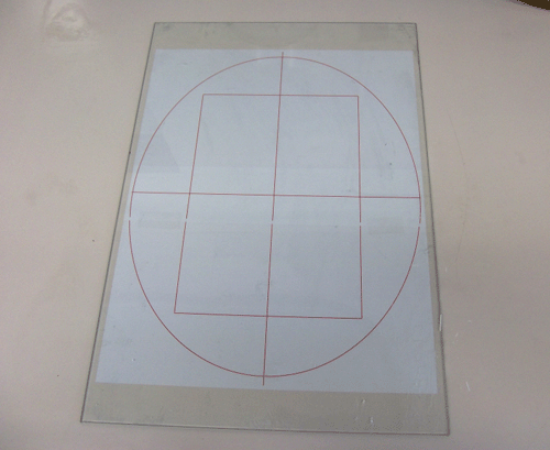 (2)作業台の上に楕円を描いた紙を置き、その上に透明なガラス板を重ねる。(写真1)