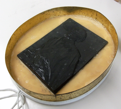 油粘土の場合、レリーフの表面で脂分の為に石膏が弾いたりします。その時は、やわらかい刷毛(羊毛の筆など)で石膏を塗るようにして馴染ませます。