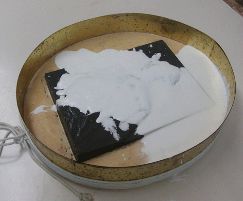 元型に石鹸溶液の離型剤を掛け、浸み込まなくなって来たら、よく攪拌した石膏を流し込みます。