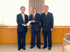 11月4日(金)に、白岡市小島卓町長を菊地会長と小出副会長が訪問し、「第10回白岡市美術家協会展」における東日本大震災復興支援チャリティーの収益金と、会場に設置した募金箱による会員と来場者の募金を義援金として贈りました。