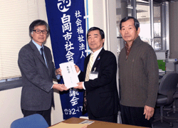1月17日(木)に、白岡市美術家協会展で実施した「東日本大震災復興支援チャリティー」の収益金と募金箱への募金を、小出二郎、中村和彦、田續和男の3副会長が白岡市社会福祉協議会を訪問しお届けし、今回の協会展の実行委員長を務めた中村さんから荒井富夫事務局長へお渡ししました。